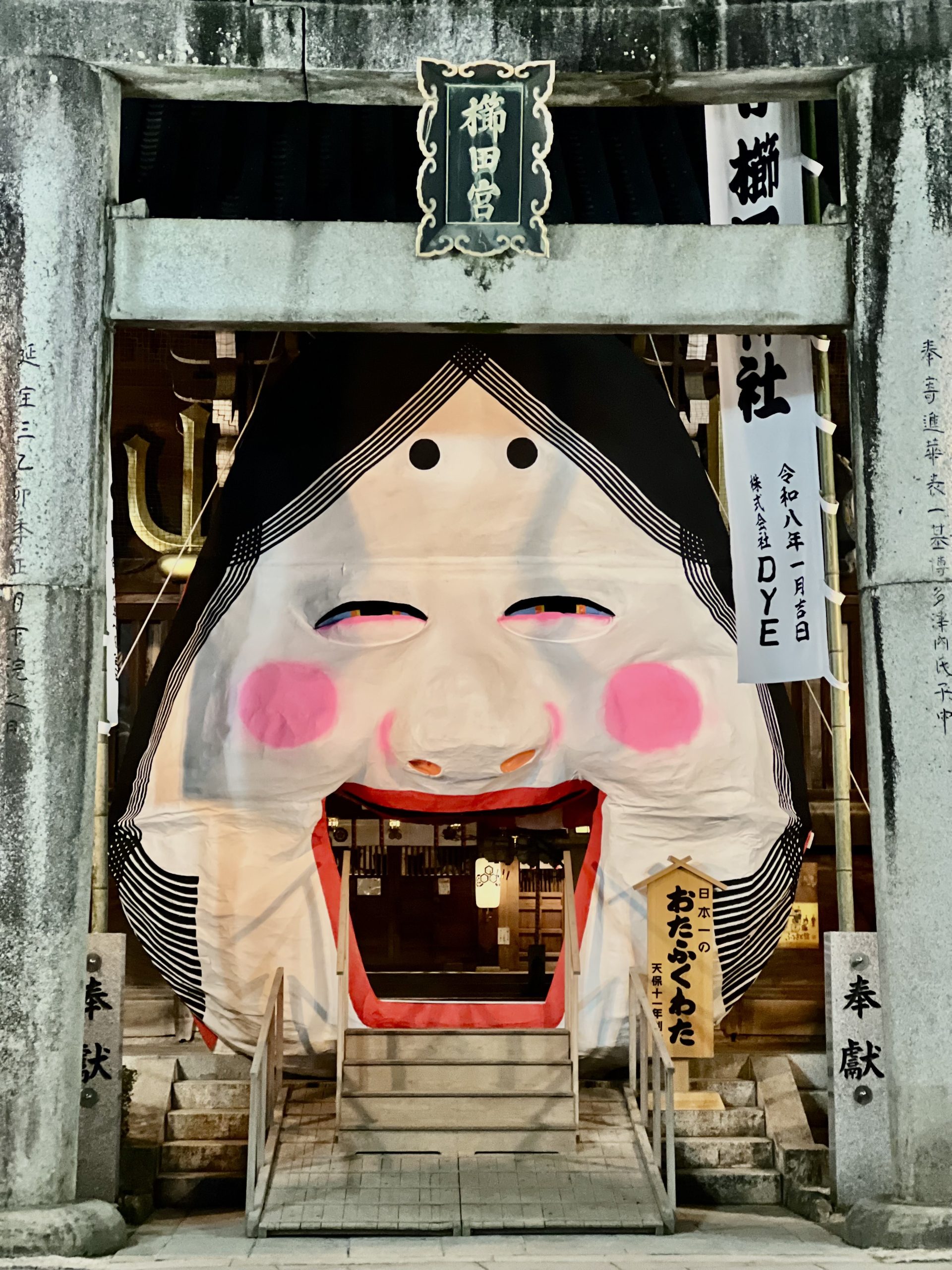 毎年この時期の恒例行事として親しまれている、櫛田神社の世界一のお多福面が、今年も境内に設置されました。