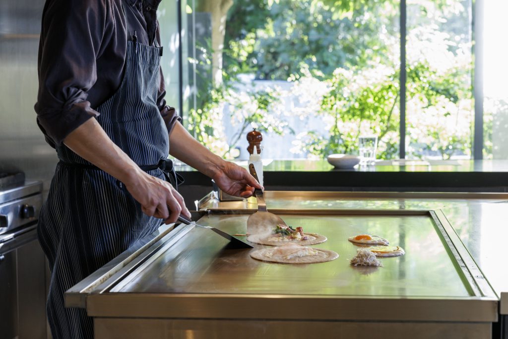 全3種類のトッピングからお好みに合わせて選べるメインディッシュのガレットは、目の前の鉄板で焼き上げた出来立てをご提供いたします。